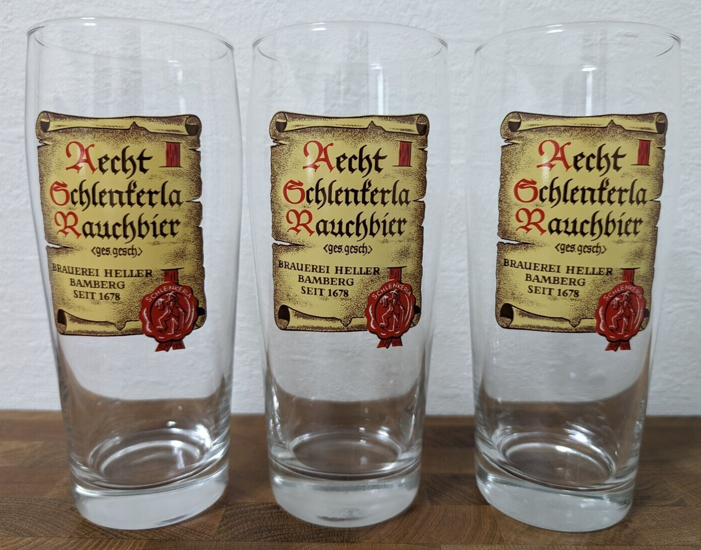 Enhance your beer tasting sessions with this set of three authentic Aecht Schlenkerla Rauchbier Glasses. Each glass holds 0.5 liters, perfect for savoring traditional German smoked beers. Featuring the iconic Schlenkerla brewery label, these glasses are a must-have for beer enthusiasts and collectors alike. Crafted for durability and designed to highlight the complex flavors of Rauchbier, this set promises to add a touch of Bamberg brewing tradition to your collection. Get yours today and share the experience with friends!
