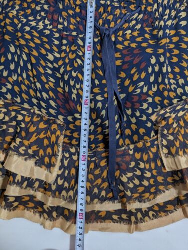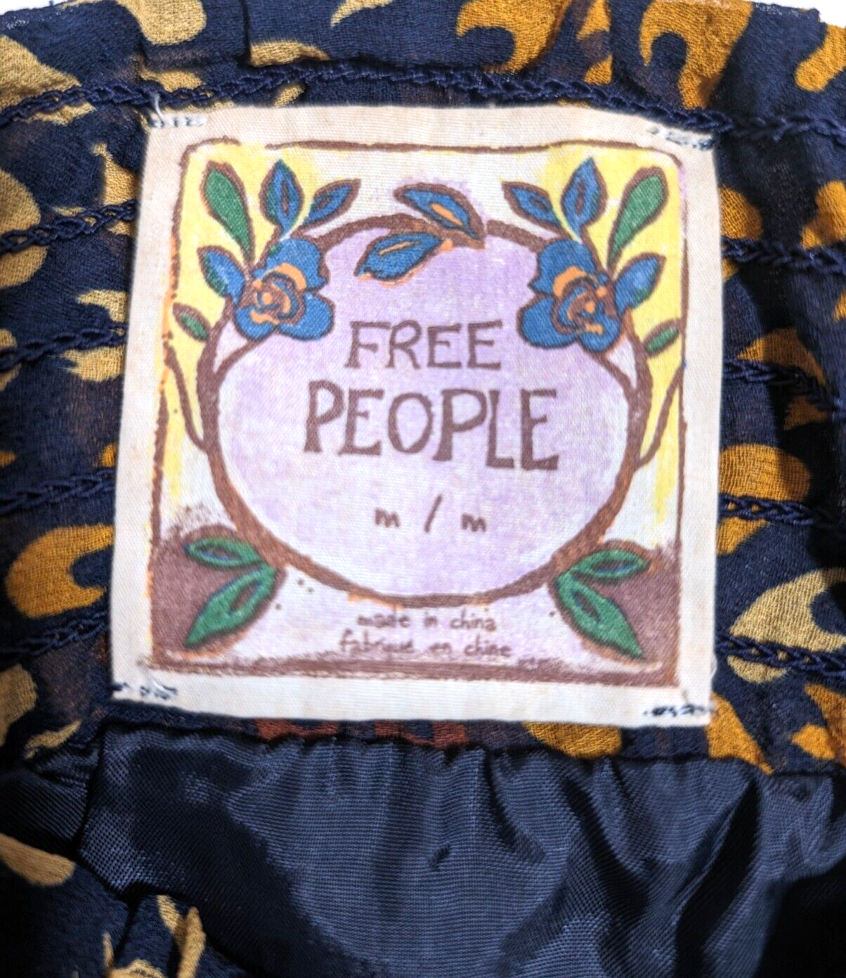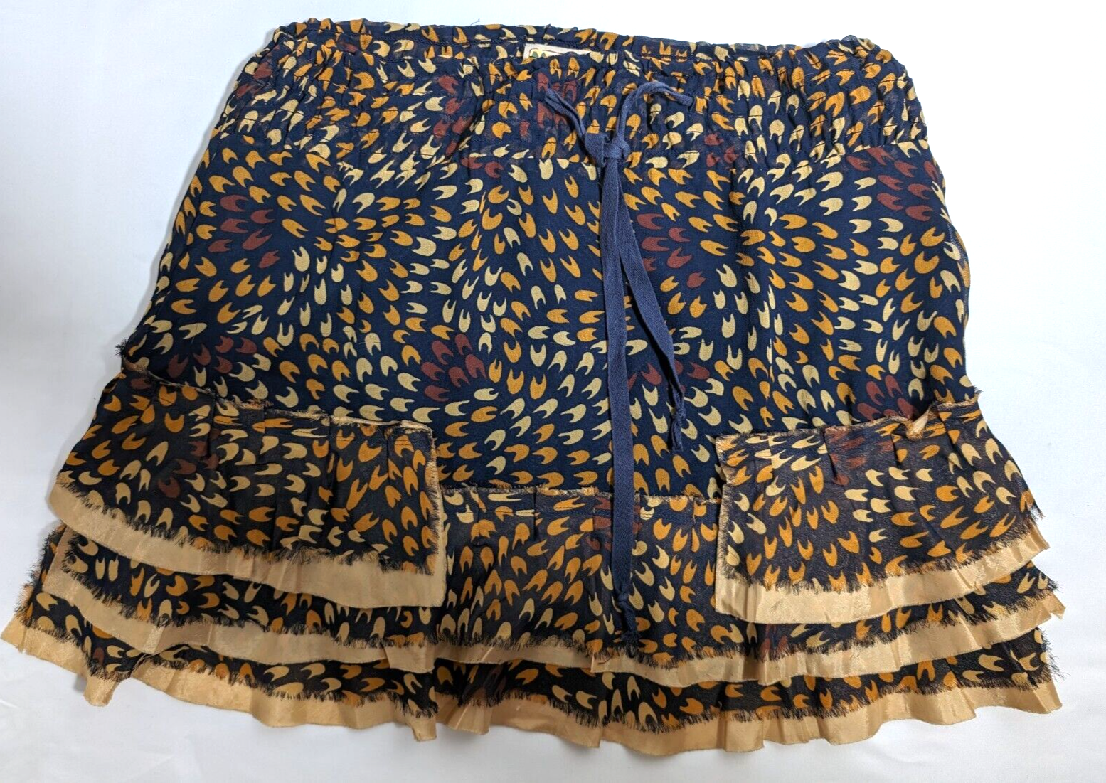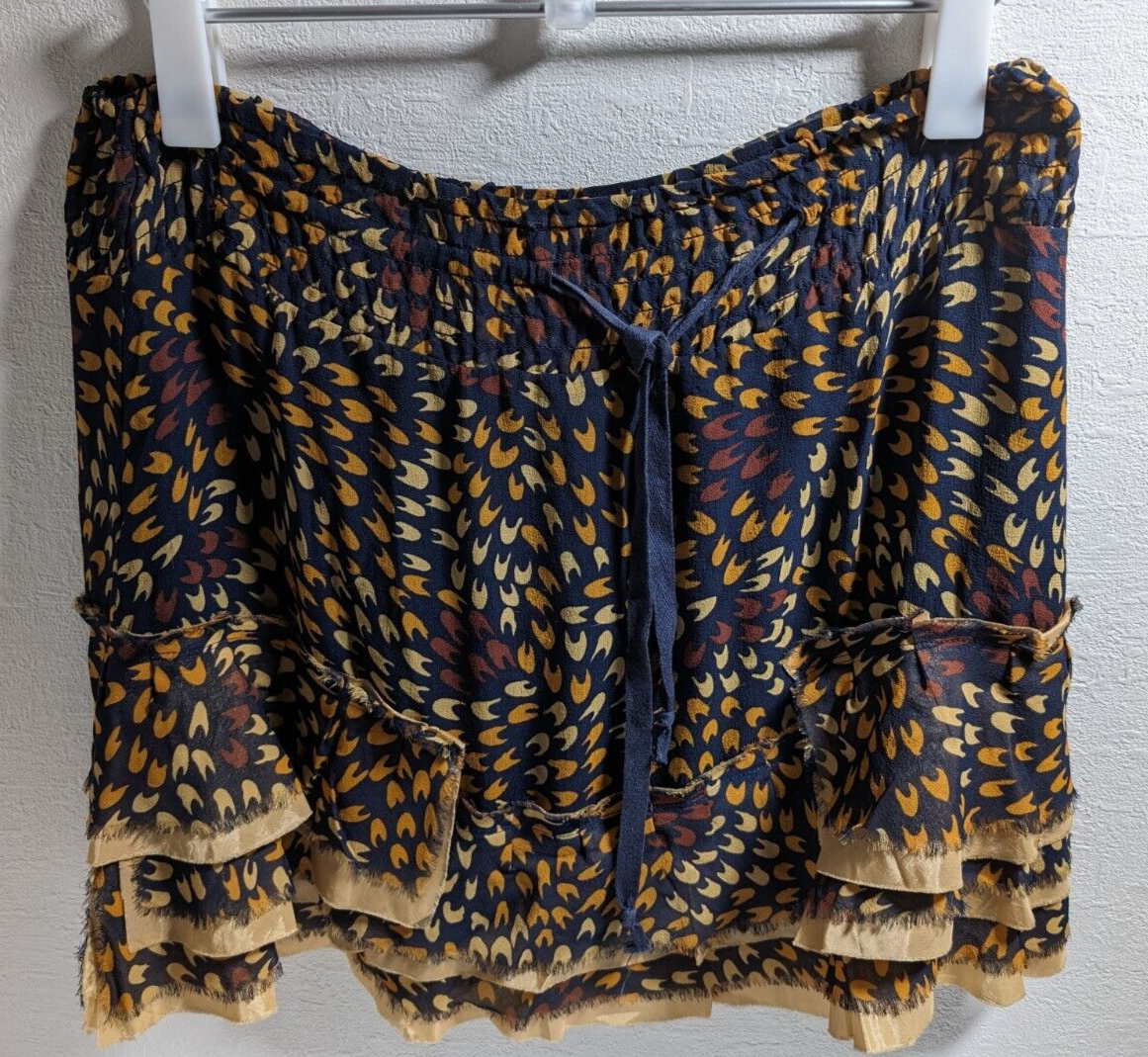 This Free People mini skirt features a vibrant multicolor pattern with a ruffled hem for a boho-chic look. Designed in size M/M, it offers an elastic waistband for a comfortable fit. The skirt measures approximately 38 cm (15 inches) in length. Perfect for casual outings or summer festivals, this skirt adds a touch of fun and style to your wardrobe. Made in China.