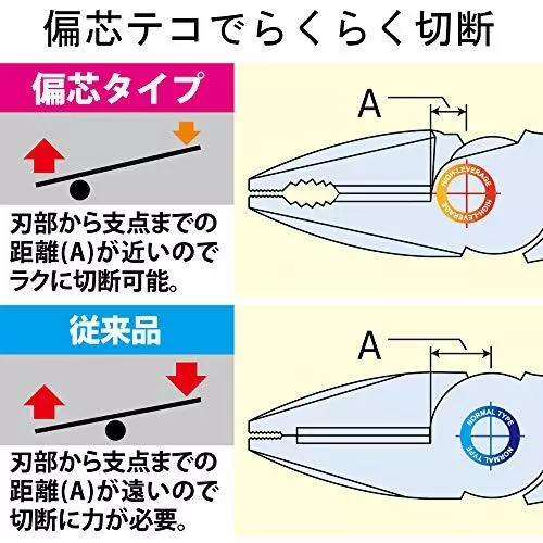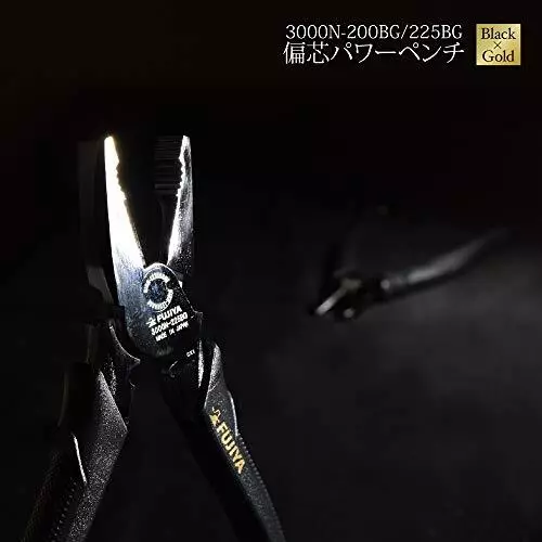 Fujiya Eccentric power pliers (with black gold and shackle) 200 mm Easy cutting with eccentric lever 3000N-200BG. eccentric lever function allows cutting lighter than conventional products. Compared to standard pliers, the hardness and shape of the grip have been changed to achieve durability and slip resistance.