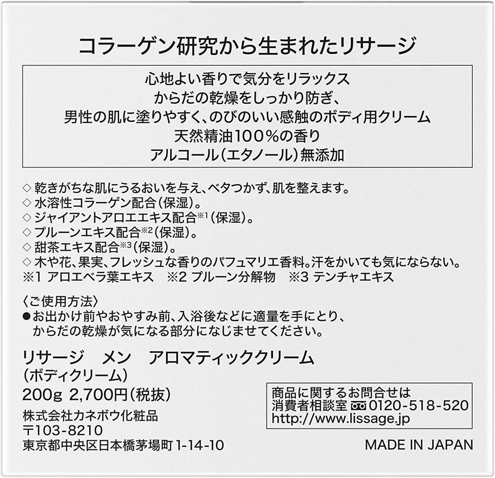 Kanebo LISSAGE MEN aromatic cream is a luxurious body cream designed specifically for men. This 200g cream is infused with a refreshing aromatic scent that invigorates the senses. Enriched with hydrating ingredients, this cream deeply moisturizes the skin, leaving it soft and smooth. The lightweight formula absorbs quickly, without leaving a greasy residue. Perfect for daily use, this cream helps to improve skin texture and overall appearance. Treat yourself to the ultimate grooming experience with Kanebo LISSAGE MEN aromatic cream.