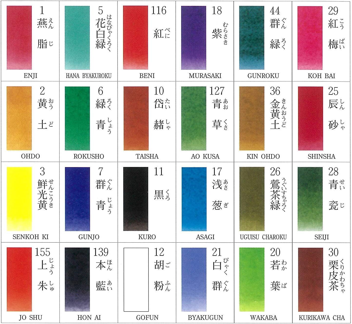 This set contains 24 colours: Enji, Ohdo, Senkoh Ki, Hana Byakuroku, Rokusho, Gunjo, Beni, Taisha, Kuro, Murasaki, Ao Kusa, Asagi, Gunroku, Kin Ohdo, Uguisu Charoku, Koh Bai, Shinsha, Seji, Jo Shu, Hon Ai, Gofun, Byakugun, Wakaba, and Kurikawa Cha.