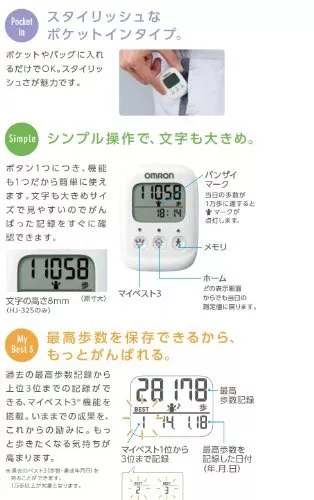 The OMRON Pedometer White HJ-325-W is a high-quality health device from Japan that accurately tracks your daily steps, distance, and calories burned. This sleek and compact pedometer is easy to use and provides motivation to stay active and reach your fitness goals. With its advanced technology and reliable performance, the OMRON Pedometer is the perfect tool to help you monitor your physical activity and improve your overall health and well-being.