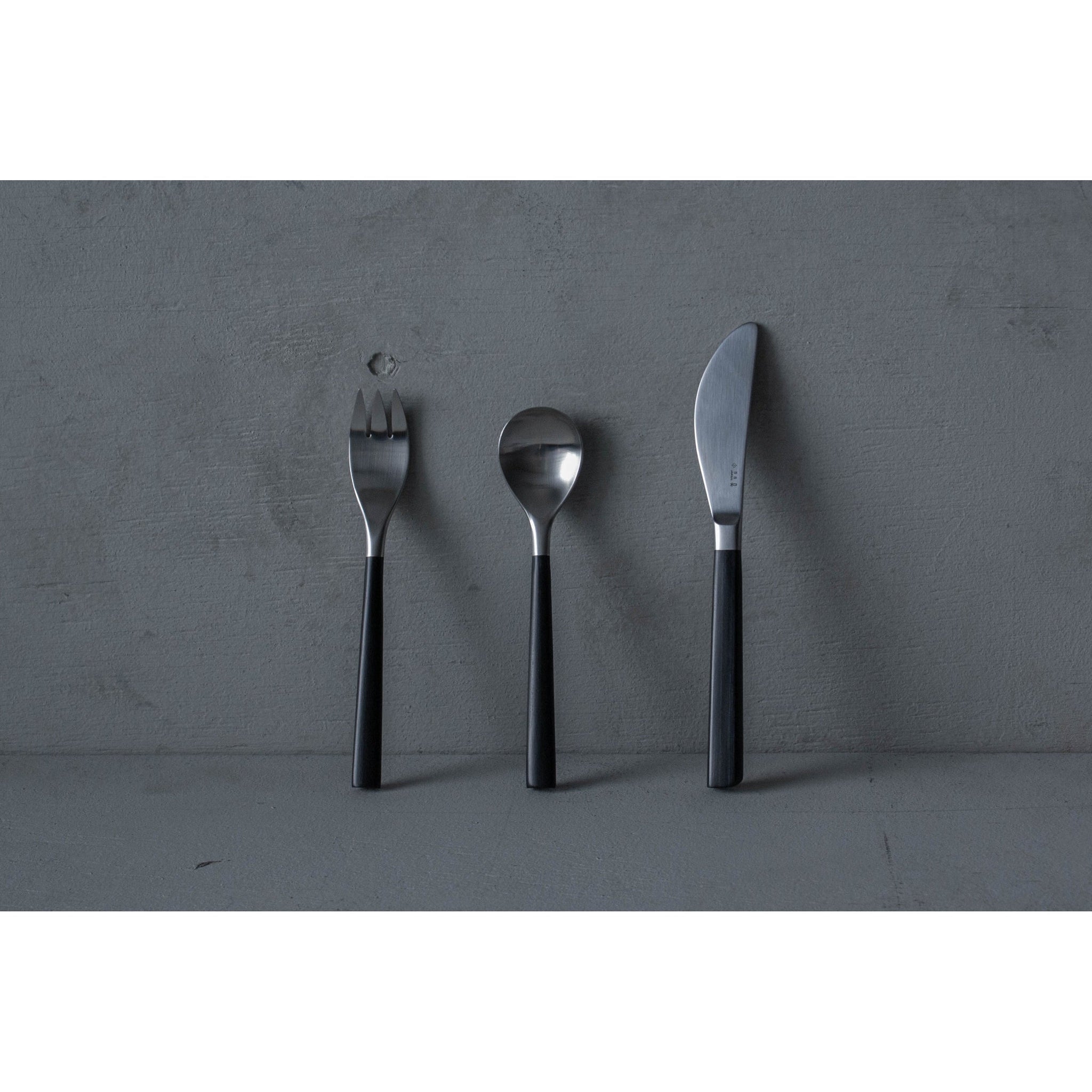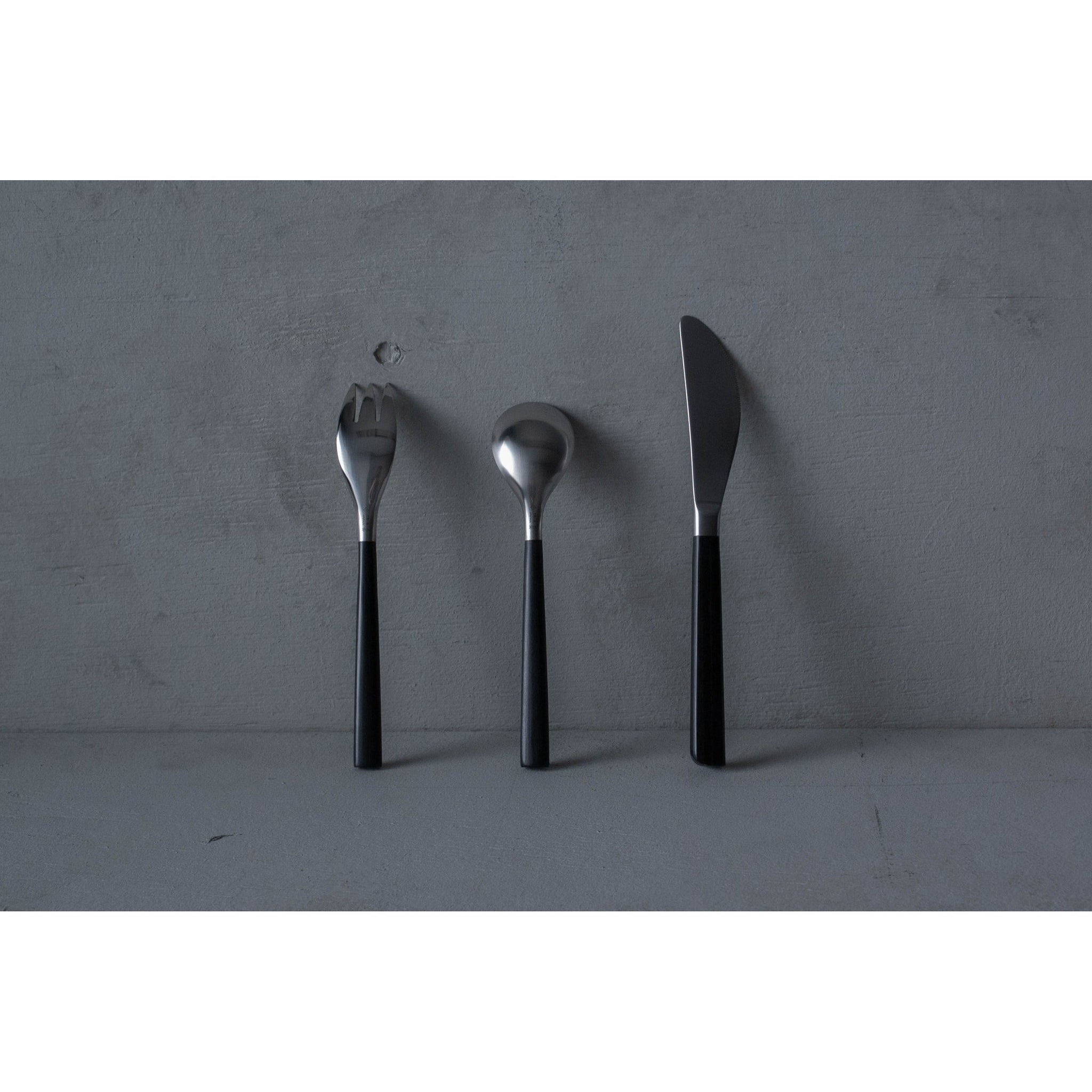 Its black handle is made with tough and long-lasting laminated wood. It has a soft touch feel compared with fully-metallic cutlery. Do not forget to appreciate its beautiful woodgrain.