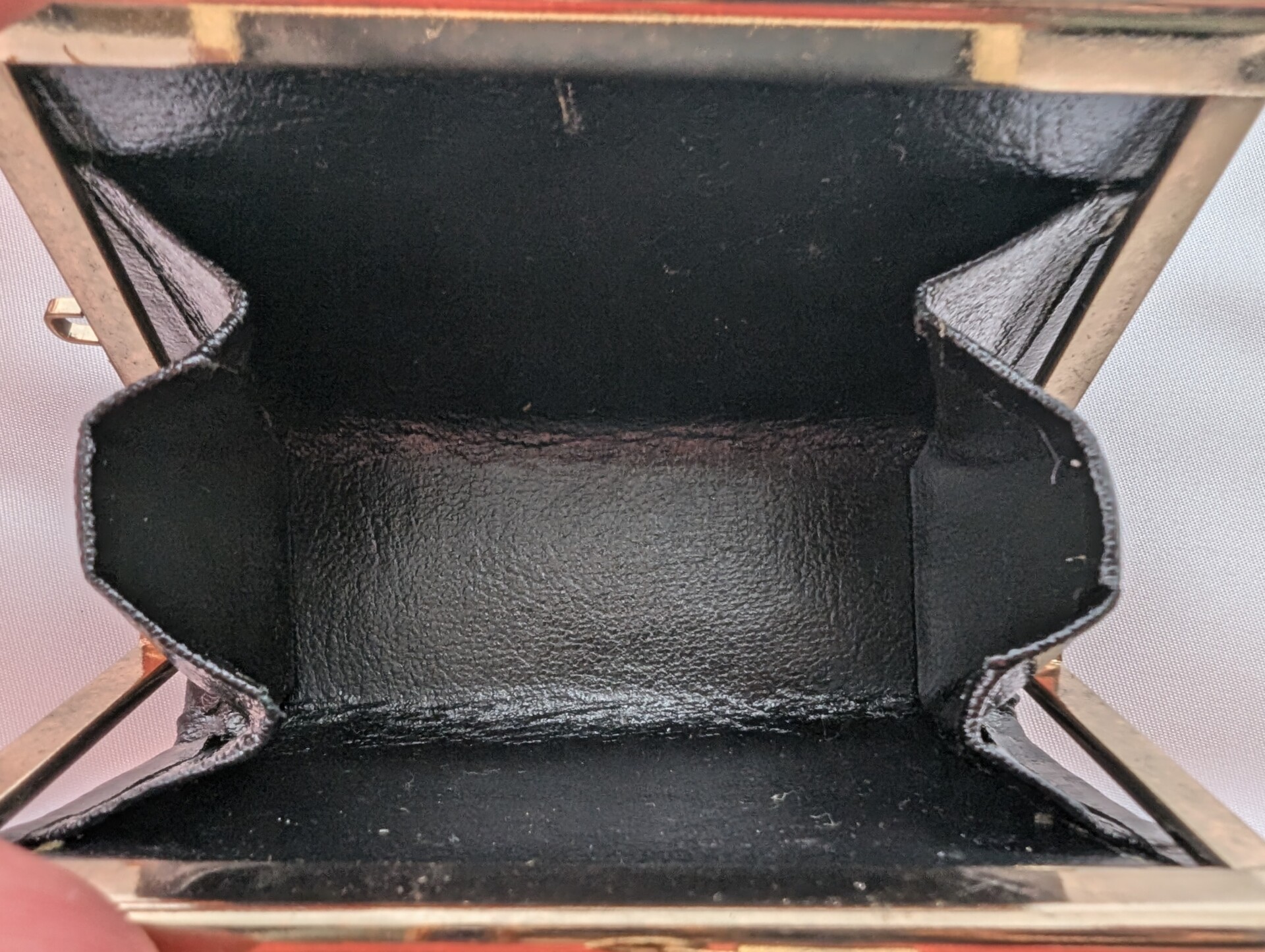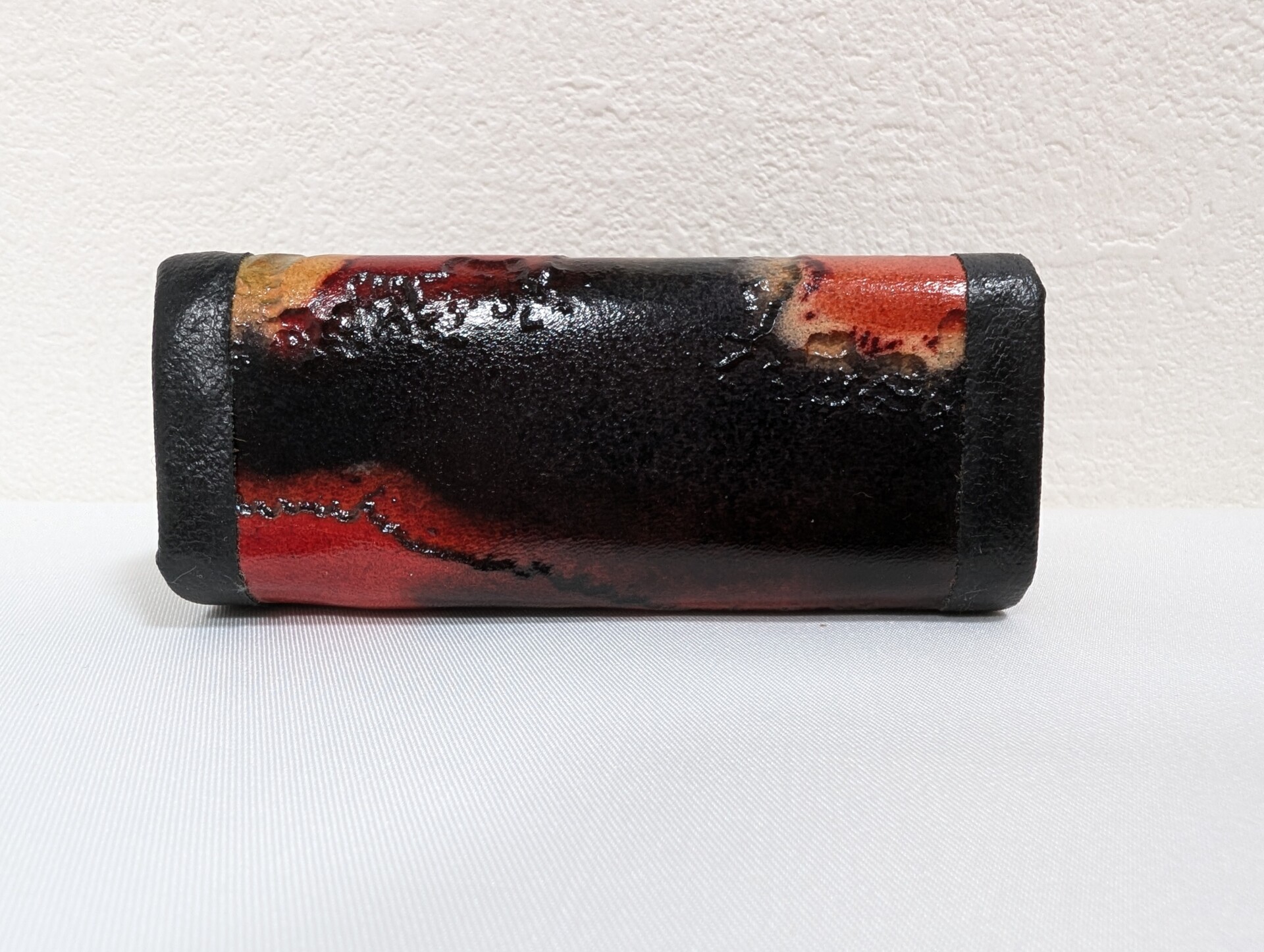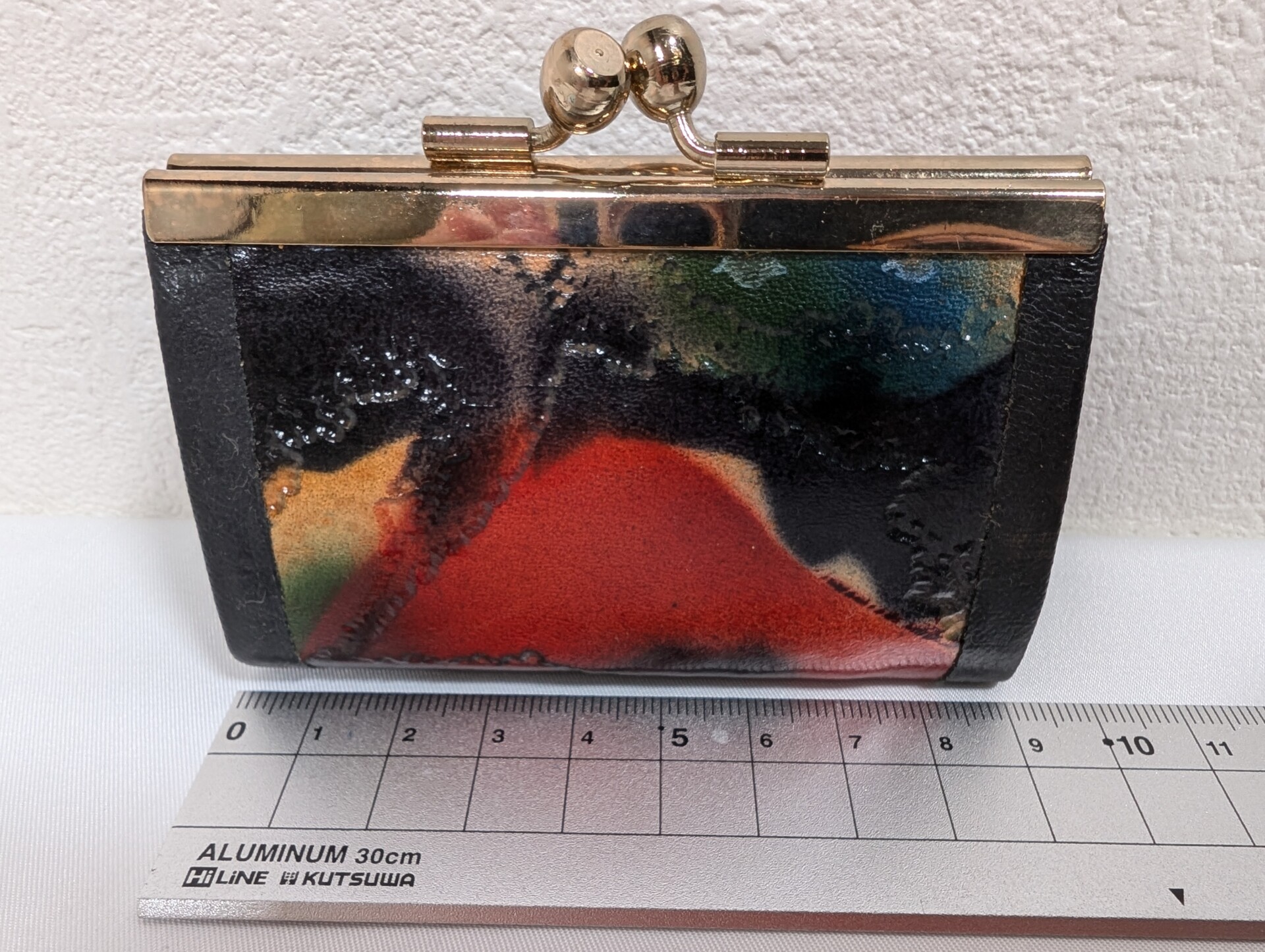 This vintage Japanese coin purse features a unique abstract design, with vibrant red, black, green, and yellow hues. It has a sturdy clasp closure in a shiny gold-tone metal. Compact and elegant, this purse is perfect for carrying coins or small essentials. The artistic design gives it a distinctive appearance, making it both functional and stylish. Ideal for collectors of vintage or Japanese accessories.