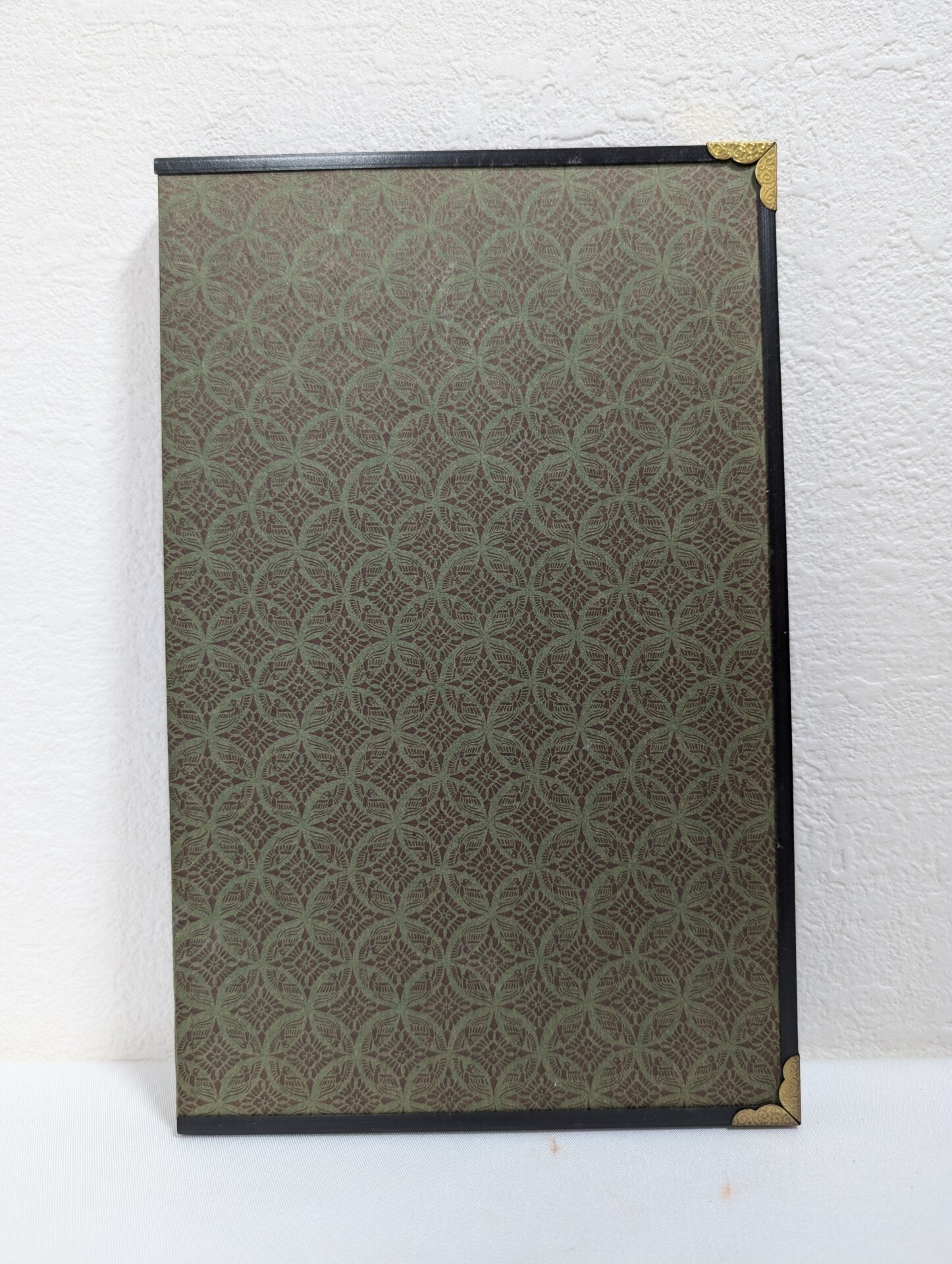 This vintage Japanese folding screen features an intricate design set against a stunning gold leaf background. The screen’s exterior is adorned with a traditional cover and accented with gold-tone corner protectors. This elegant piece makes an excellent decorative item, ideal for adding a touch of Japanese art to any space. It measures approximately 21 cm tall, as shown. Perfect for collectors or those looking to incorporate unique cultural decor into their home.