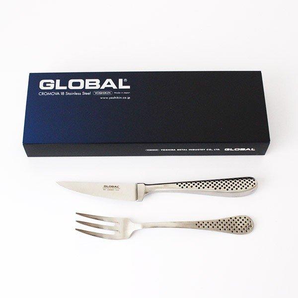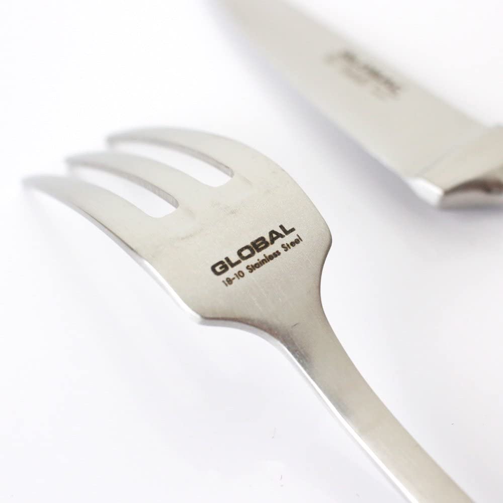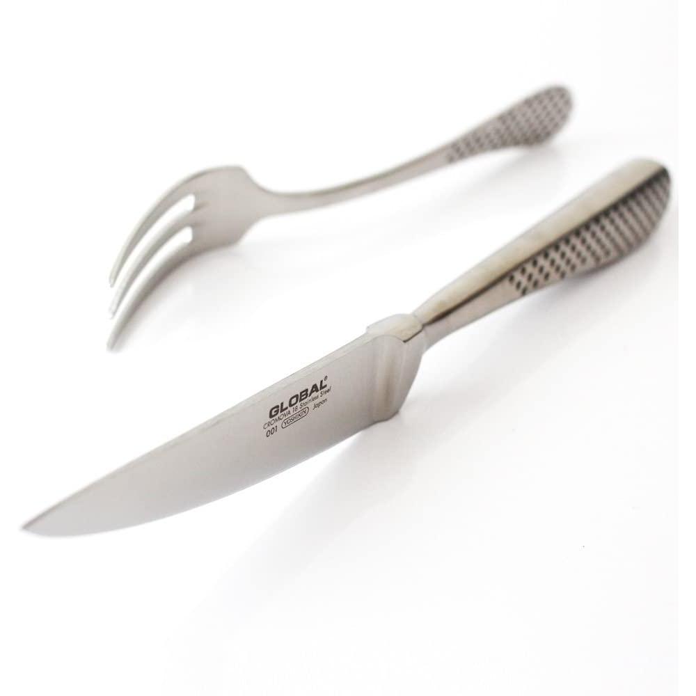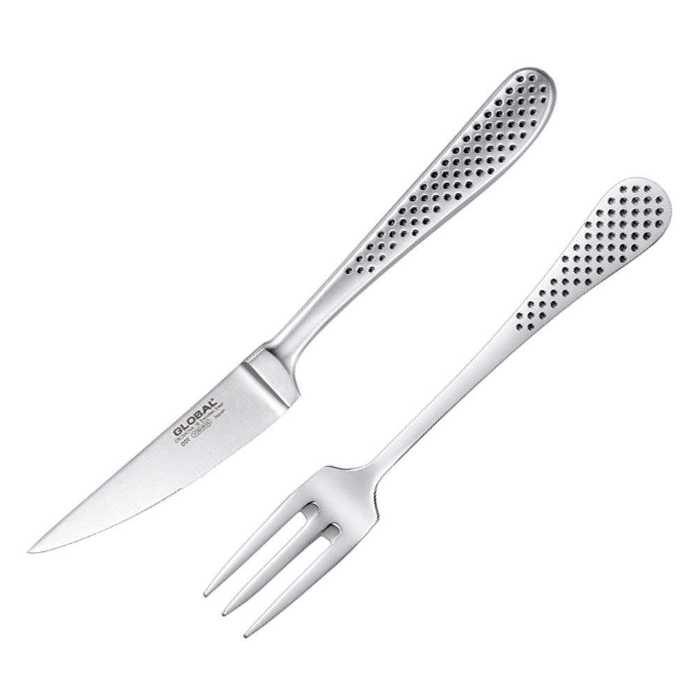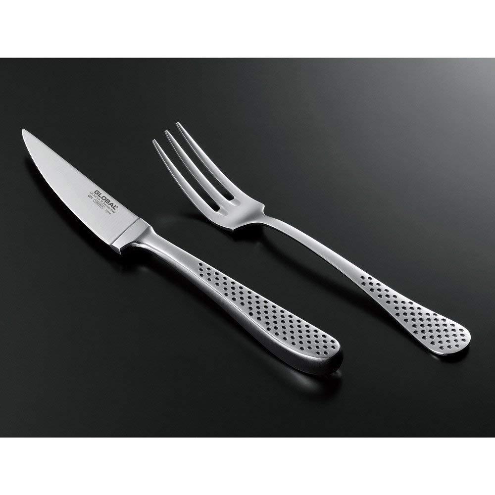 Global?Steak Knife and Fork Set featuring a nice black-dotted pattern design on the handle.